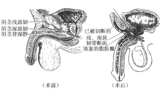 阴茎延长术的原理是根据不同男士的生理特点和延长需求,取适当位置切断阴茎上的浅悬韧带和深悬韧带,使埋藏在体内的那段阴茎海绵体分离出来,采用内填外拔的缝合技术,使阴茎体外部分延长3-5厘米。阴茎延长术根据病人胖瘦、阴毛分布、阴茎大小、血管神经分布等等,由医生设计适合的切合,不同的设计主要是避免误伤阴部外浅动脉至阴茎皮肤的分支。